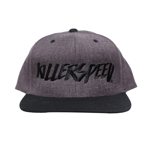 Emoridered logo on a charcoal snapback with black bill and green underside. Adjustable fit. Reinforced stitching. Classic snapback cap with premium wool blend fabric. Hard buckram. Structured