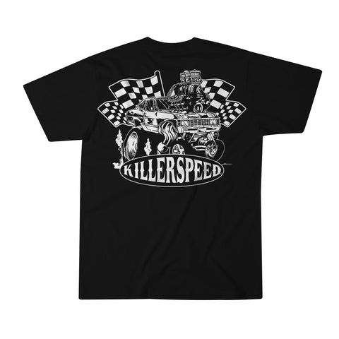 Features a one color front chest print with a four color back print and a screen-printed neck tag to eliminate that itchy tag.